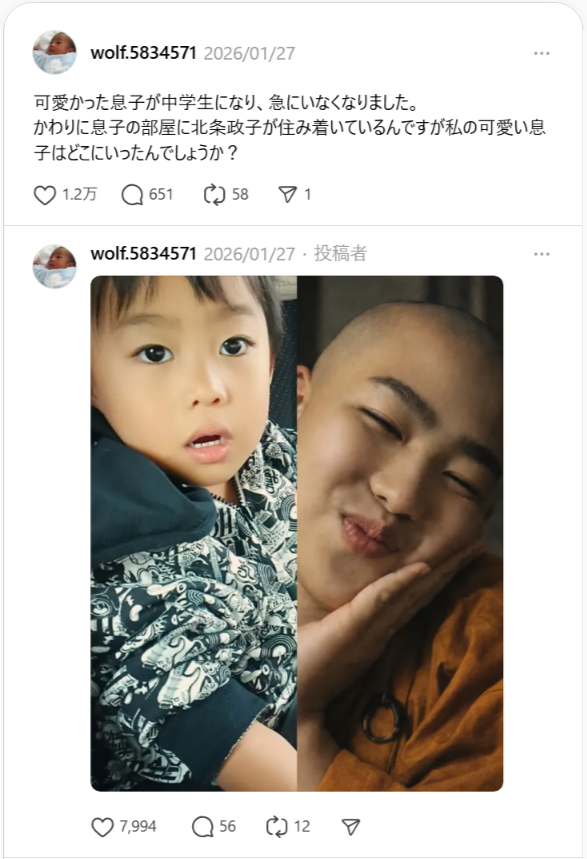 「可愛かった息子が、ある日突然いなくなった」——そんな衝撃的(?)な書き出しで始まる母の投稿が、SNSで大きな話題になっています。中学生になった息子の“現在の姿”を見た母が例えたのは、まさかの北条政子。その想像を軽く超えてくる写真に、笑いが止まらない人が続出しています。