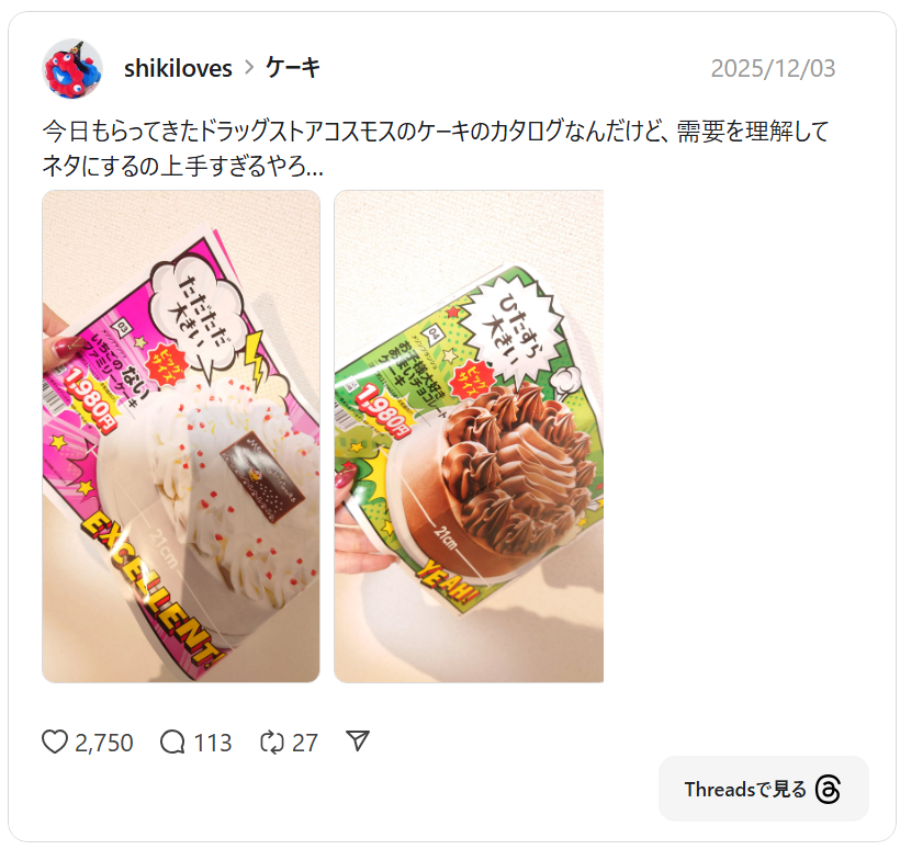 ドラッグストアコスモスの1980円クリスマスケーキは、